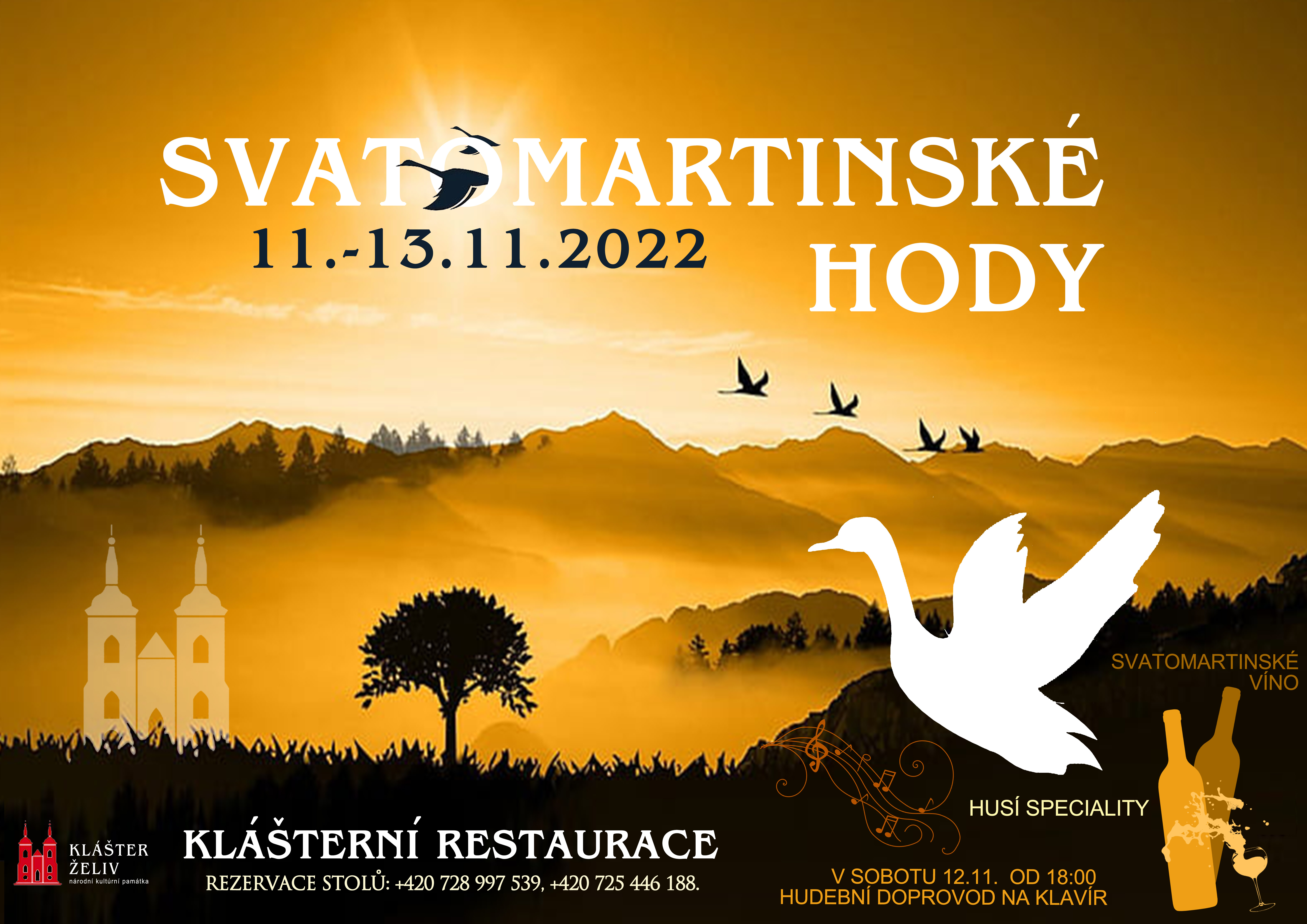 Jedinečná atmosféra tohoto netradičního víkendu v Klášterní restauraci je tu! Speciality z husy a Svatomartinské víno jsou samozřejmostí. V sobotu 12.11. od 18:00 zpříjemní večeři hra na klavír, o kterou se postará pan Petr Žák. Máte už rezervovaný stůl? REZERVACE STOLU +420 728 997 539, +420 725 446 188.