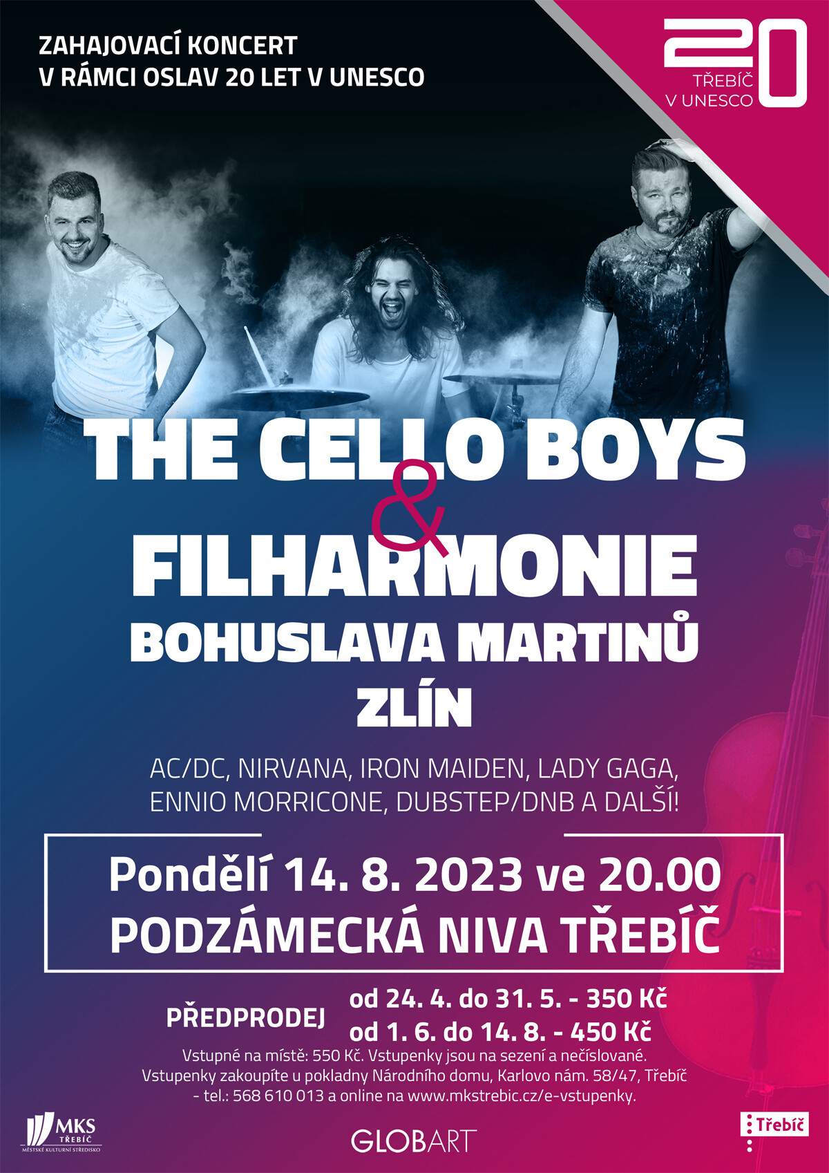 První den oslav v pondělí 14. 8. 2023 si nenechte ujít pop - rockovou koncertní show The Cello Boys, která vystoupí společně s Filharmonií Bohuslava Martinů Zlín. Koncert se uskuteční od 20 hodin na Podzámecké nivě v Třebíči.