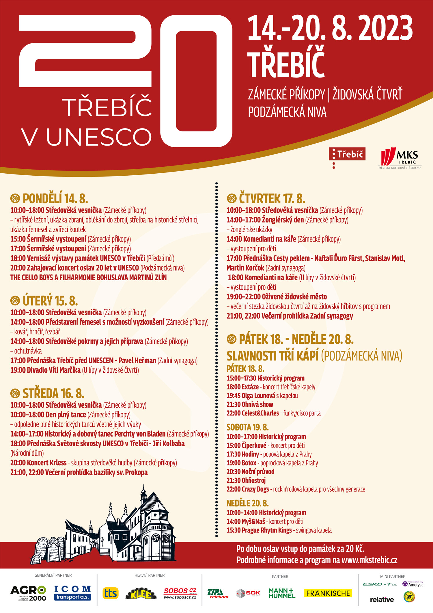 Třebíč si letos připomíná 20 let od zápisu svých památek na seznam světového kulturního a přírodního dědictví UNESCO. Během srpnových dnů proběhnou akce, které třebíčské památky připomenou – jde o židovskou čtvrť, židovský hřbitov a baziliku sv. Prokopa. Oslavy se uskuteční v týdnu od 14. do 20. 8. 2023.