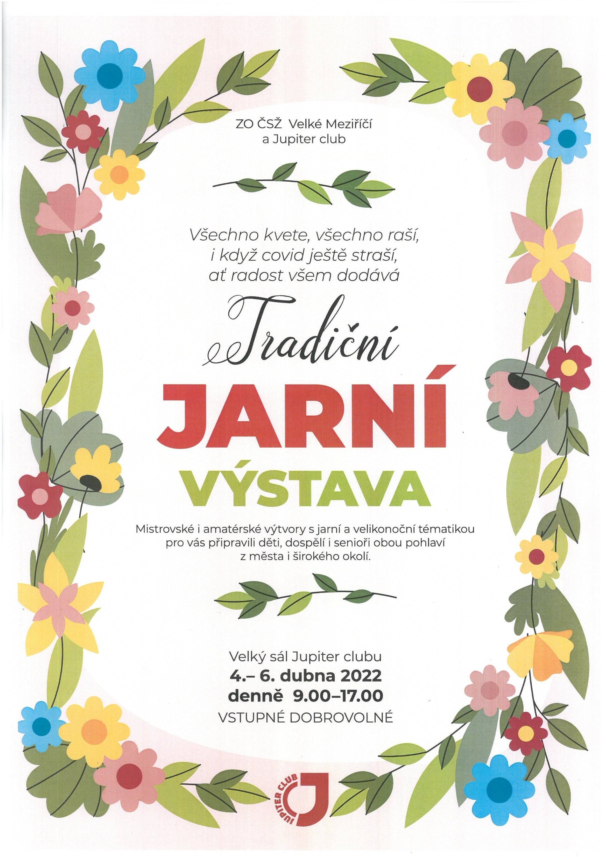 pořádá ZO ČSŽ Velké Meziříčí a Jupiter club. "Všechno kvete, všechno raší, i když covid ještě straší, ať radost všem dodává tradiční jarní výstava.