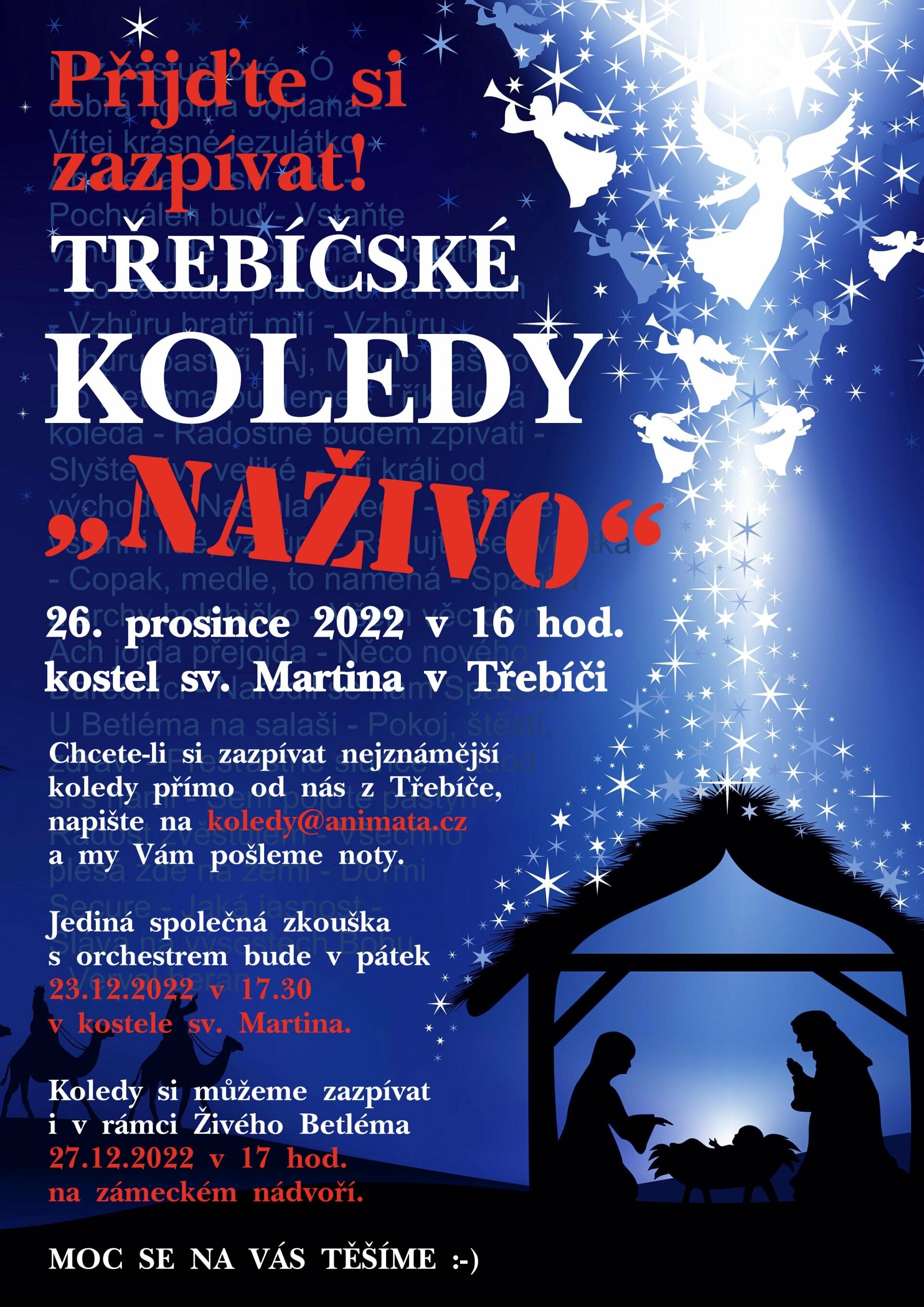 ...koledy si můžeme zazpívat nejen 26. prosince 2022 v 16 hod. (zkouška ve 14:50) v kostele sv. Martina v Třebíči, ale i v rámci Živého betlému 27. prosince 2022 v 17 hod. (zkouška v 15:30) na zámeckém nádvoří u baziliky sv. Prokopa.