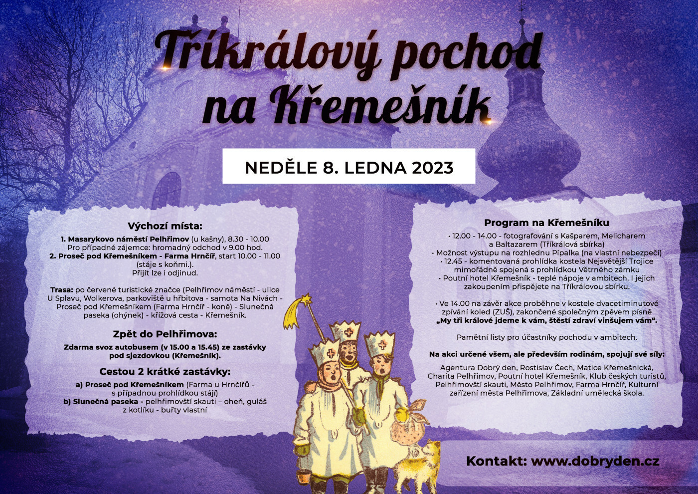 Zcela tradičně bude neděle nejbližší svátku Tří králů (tentokrát tedy 8. ledna 2023) patřit na trasách mezi Pelhřimovem a Křemešníkem Tříkrálovému pochodu, který Agentura Dobrý den z popudu pana Rostislava Čecha a ve spolupráci s řadou subjektů pořádá ve prospěch Tříkrálové sbírky, kterou u nás organizuje Charita Pelhřimov. Ani ne 10 km měřící výšlap startuje
