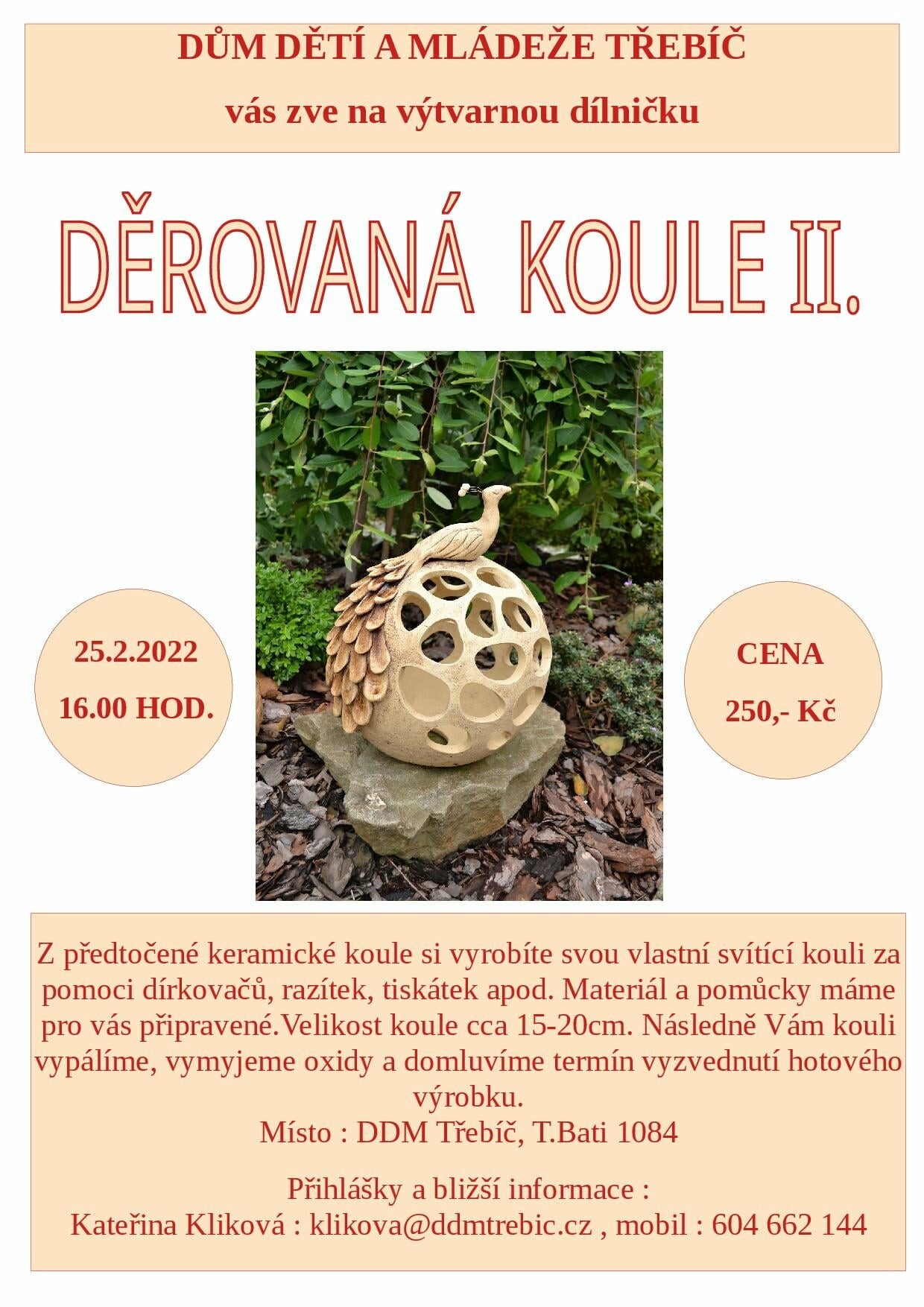 Vyrobte si vlastní svítící kouli za pomoci dírkovačů, razítek, tiskátek, apod. Materiál a pomůcky jsou pro vás připravené. Následně vám koule bude vypálena a domluvíte termín vyzvednutí hotového výrobku.