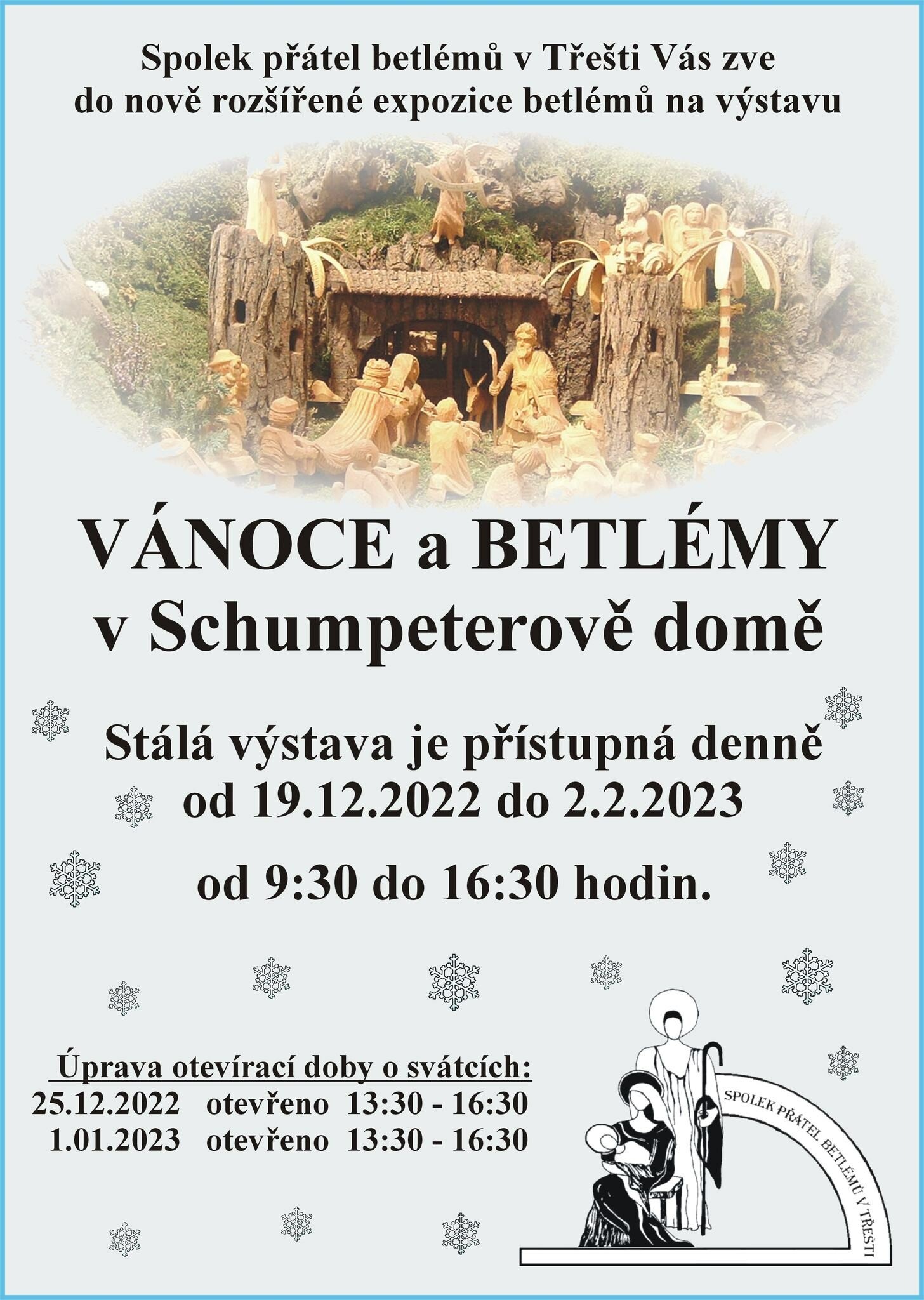 Spolek přátel betlémů v Třešti Vás zve do nově otevřené expozice betlémů na výstavu Vánoce a betlémy v Schumpeterově domě. Stálá výstava je přístupná denně od 19.12.2022 do 2.2.2023. Od 9:30 do 16:30 hodin.