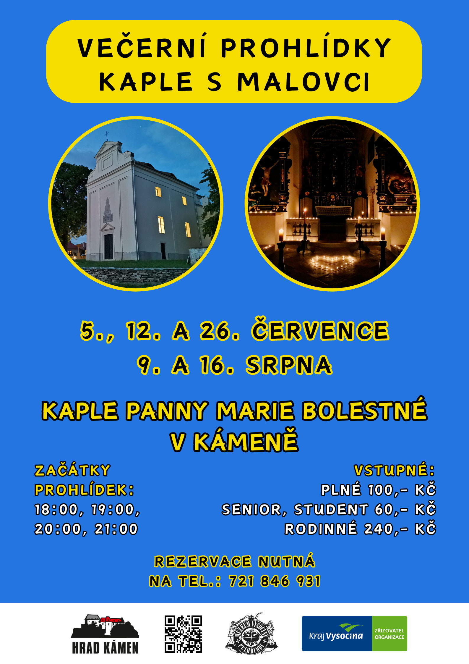 Dále Vás Muzeum Vysočiny Pelhřimov, p. o. srdečně zve na večerní komentované prohlídky kaple Panny Marie Bolestné v Kámeně, které se uskuteční v jedinečné atmosféře za doprovodu průvodců v kostýmu rytíře Jana Kryštofa Malovce z Malovic nebo jeho ženy Marie Veroniky Švihovské. Dozvíte se řadu informací o historii kaple, seznámíte se s poutavými osudy a nebudou chybět ani různé zajímavosti. Plné vstupné činí 100,- Kč, snížené (studenti, senioři) 60,- Kč a rodinné (2 dospělí + 2 až 3 děti) 240,- Kč. Prohlídky budou začínat v časech 18:00, 19:00, 20:00 a 21:00 hodin. Z důvodu omezené kapacity je nutné si večerní prohlídku rezervovat na tel. čísle 721 846 931.