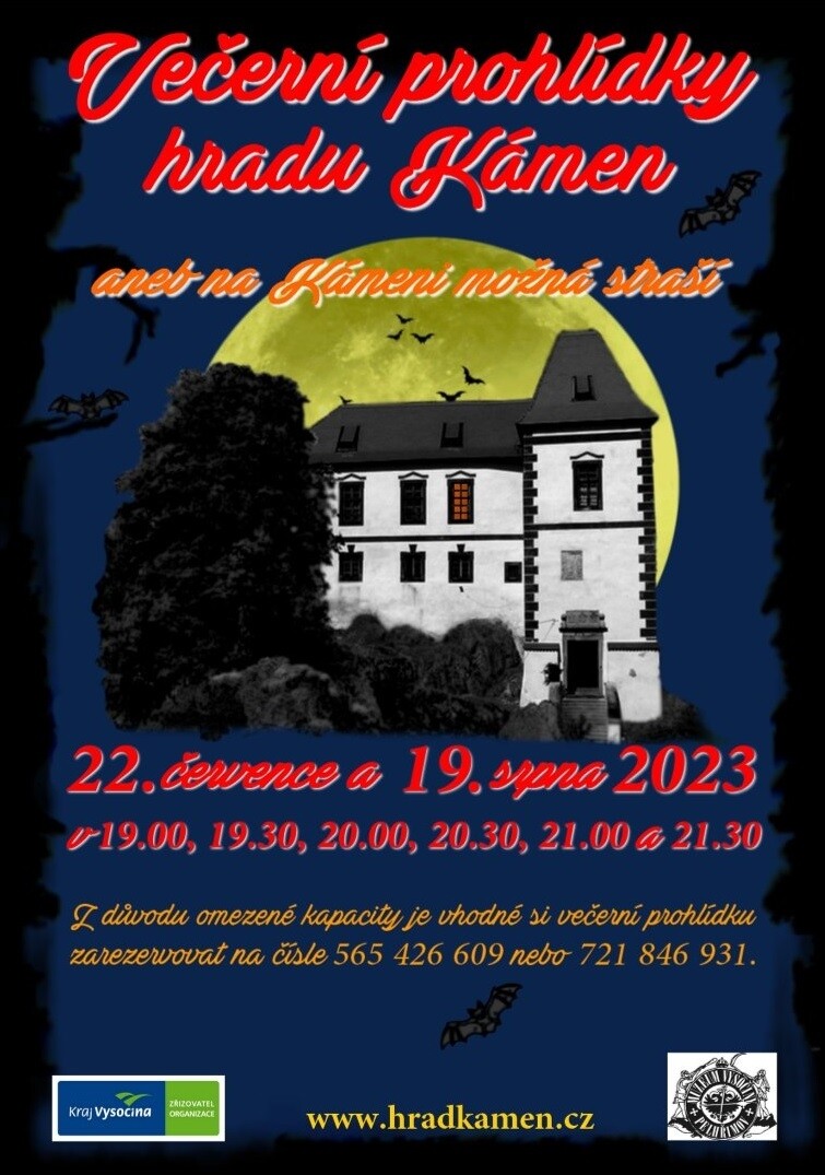 Říká se, že na každém správném hradě straší. Výjimkou by tedy neměl být ani hrad Kámen, přijďte se přesvědčit sami. Prohlídky jsou připraveny tak, aby poučily a pobavily jak děti, tak i dospělé a budou začínat v časech 19.00, 19.30, 20.00, 20.30, 21.00 a 21.30 hodin.