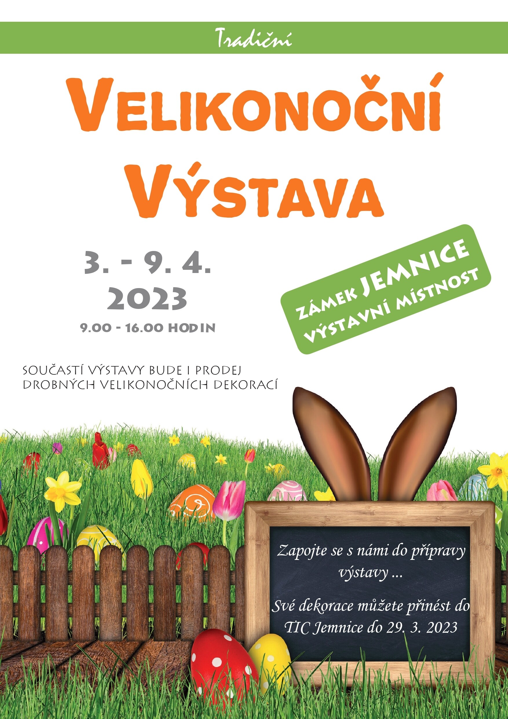 - zapojte se s námi do přípravy výstavy a vytvořte velikonoční dekoraci, tu pak přineste do Informačního centra v Jemnici (do 29.3.2023), případně zavolejte na tel. 721 508 737