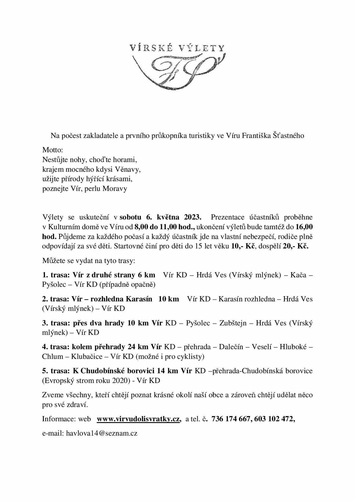 Výlety se uskuteční v sobotu 6. května 2023. Prezentace účastníků proběhne v Kulturním domě ve Víru od 8:00 do 11:00, ukončení...