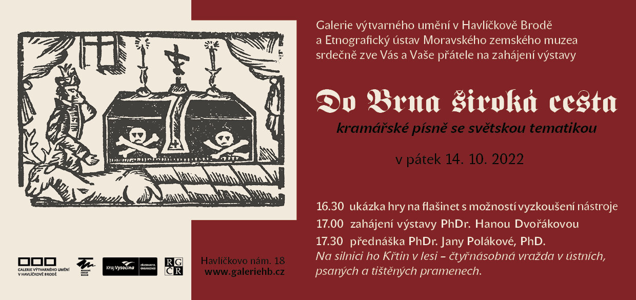 GVU a Etnografický ústav MZM připravili výstavu k tématice světských kramářských písní pod názvem Do Brna široká cesta. Vernisáži bude předcházet ukázka hry na flašinet s možností vyzkoušení nástroje. Po vernisáži bude následovat přednáška kurátorky Jany Polákové na téma čtyřnásobné vraždy v křtinských lesích v dobových pramenech.