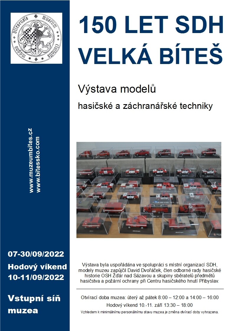 Městské muzeum ve Velké Bíteši připravilo pro letošní hodový týden výstavu k příležitosti 150. výročí založení dnešního Sboru dobrovolných hasičů. Výstava instalovaná ve vstupní síni muzea v sobě obsahuje modely hasičské a záchranářské techniky, které muzeu zapůjčil jejich sběratel a člen bítešského...