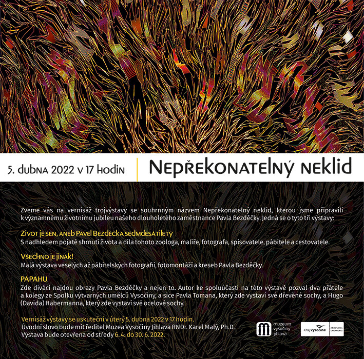 Na druhé čtvrtletí tohoto roku připravuje Muzeum Vysočiny Jihlava v přízemí expoziční budovy výstavu s názvem „Nepřekonatelný neklid“. Jedná se vlastně o tři výstavy, či svým způsobem trojvýstavu, k významnému životnímu jubileu našeho dlouholetého zaměstnance Pavla Bezděčky.