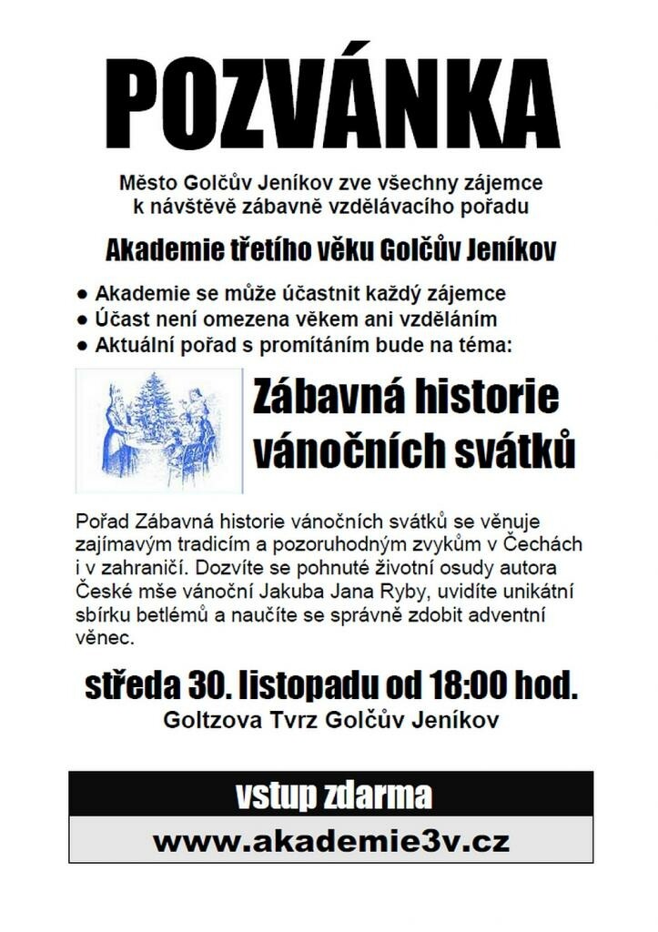 Pořad Zábavná historie vánočních svátků se věnuje zajímavým tradicím a pozoruhodným zvykům v Čechách i v zahraničí. Vstup zdarma.