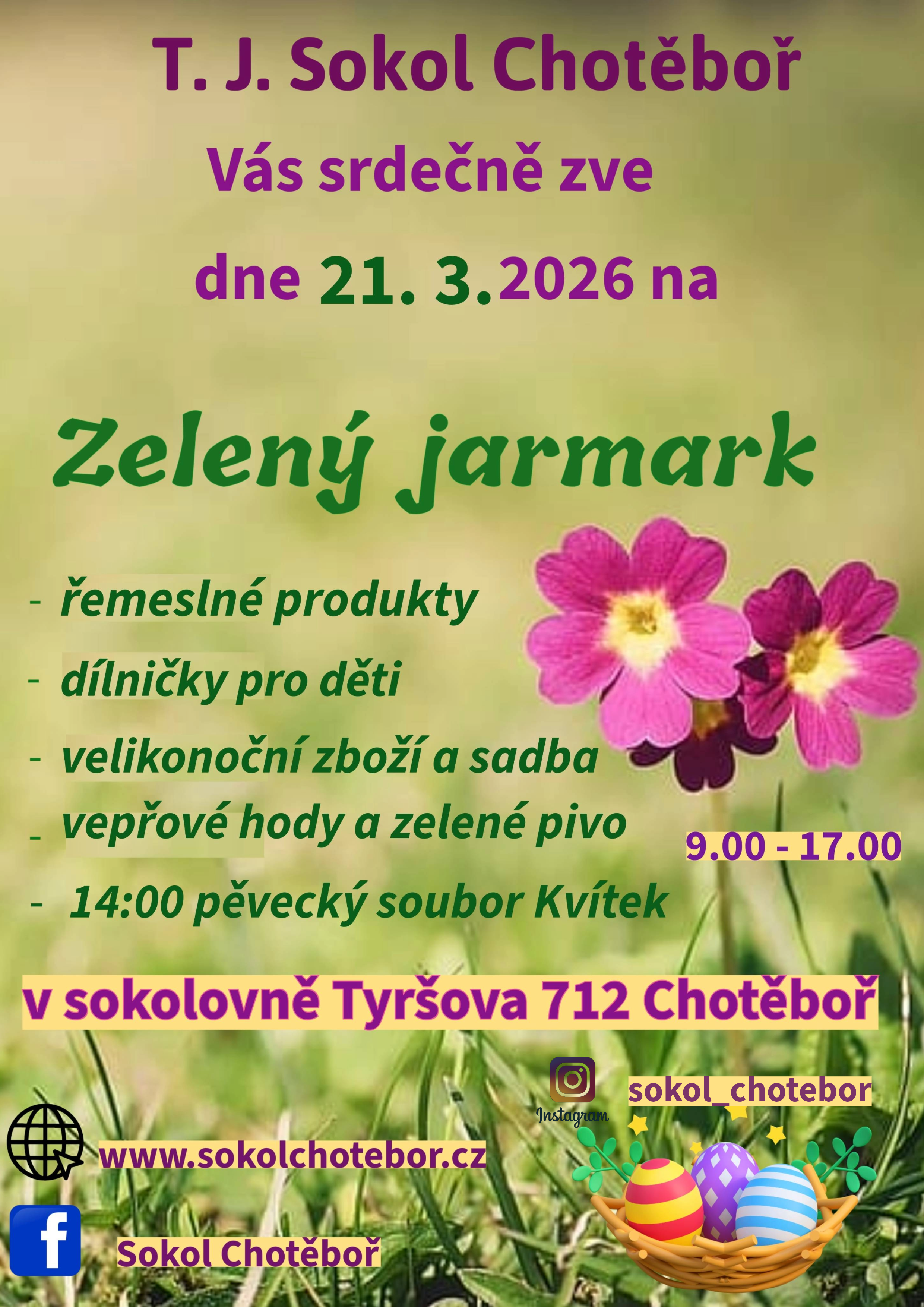 Blíží se náš první Zelený jarmark v chotěbořské sokolovně! Milovníci masa jistě ocení vepřové hody. Můžete ochutnat zelené pivo, víno, medovinu a originální zrnkovou kávu. Pro děti máme připraveny 4 různé dílničky a zábavný fotokoutek pro všechny. Odpoledne se můžete těšit na dětské pěvecké vystoupení. Kromě 40 stánků s rukodělnými...