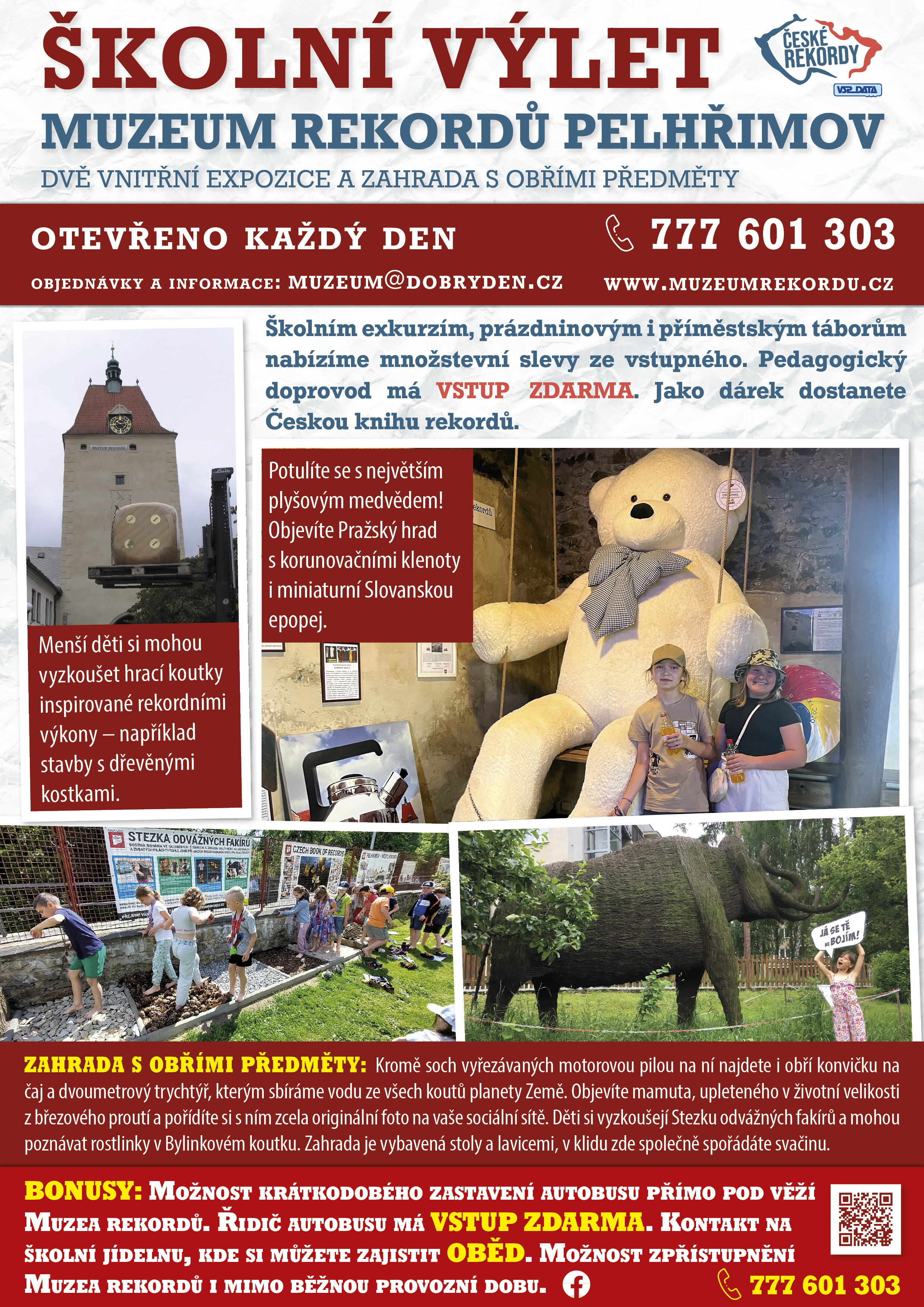 - Muzeum rekordů a kuriozit Pelhřimov – dvě vnitřní expozice a zahrada s obřími předměty. Možnost krátkodobého zastavení autobusu přímo pod věží Muzea rekordů. Je zde možné dostat i kontakt na školní jídelnu, kde je možné zajistit si oběd.