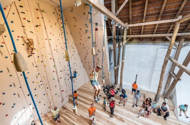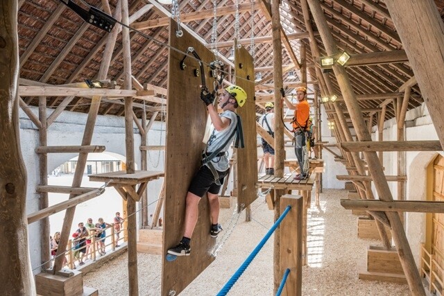 V areálu Panského dvora v Telči čeká na zájemce lanový park s cepíny a nízké lanové překážky a lezecké stěna a vysoké překážky.