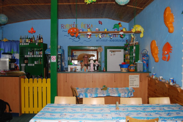 Zajímavou atmosféru vyvolávají velká tabulková okna po celé délce objektu, která poskytují krásný výhled na rybník, rozprostírající se přímo pod nimi. Hosté mají dojem, jako by seděli na zámořské lodi, která se chystá každou vteřinou zvednout kotvy a vyrazit za obzor…