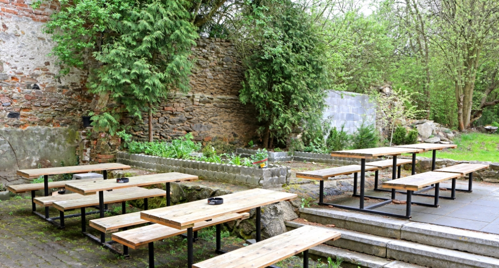 Majestátní socha kozla pak už jen přispívá k duchu restaurace, jejíž další dominantou je zachování původního průjezdu, kterým se vstupuje na rozlehlé zahradní posezení, u něhož najdete dětský koutek s pískovištěm, venkovní gril a zázemí pro cyklisty a jejich dopravní prostředky.