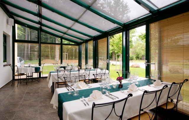 Prostor restaurace i zimní zahrady je zařízen v moderním stylu, nabízí příjemné posezení u slavnostně prostřených stolů s profesionální obsluhou.