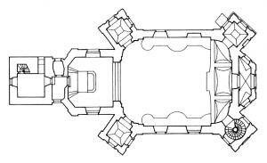 Půdorys obyčtovského kostela je připodobňován tvaru želvy, kdy obdélná loď se zkosenými rohy představovala želví tělo, nárožní čtvercové kaple nohy, mělký presbytář se seříznutými východními rohy krk, mnohoúhelníková sakristie s hrotem v ose hlavu a západní předsíň ocas želvy. Želva je znak stálosti ve víře, věrnosti a trpělivosti.