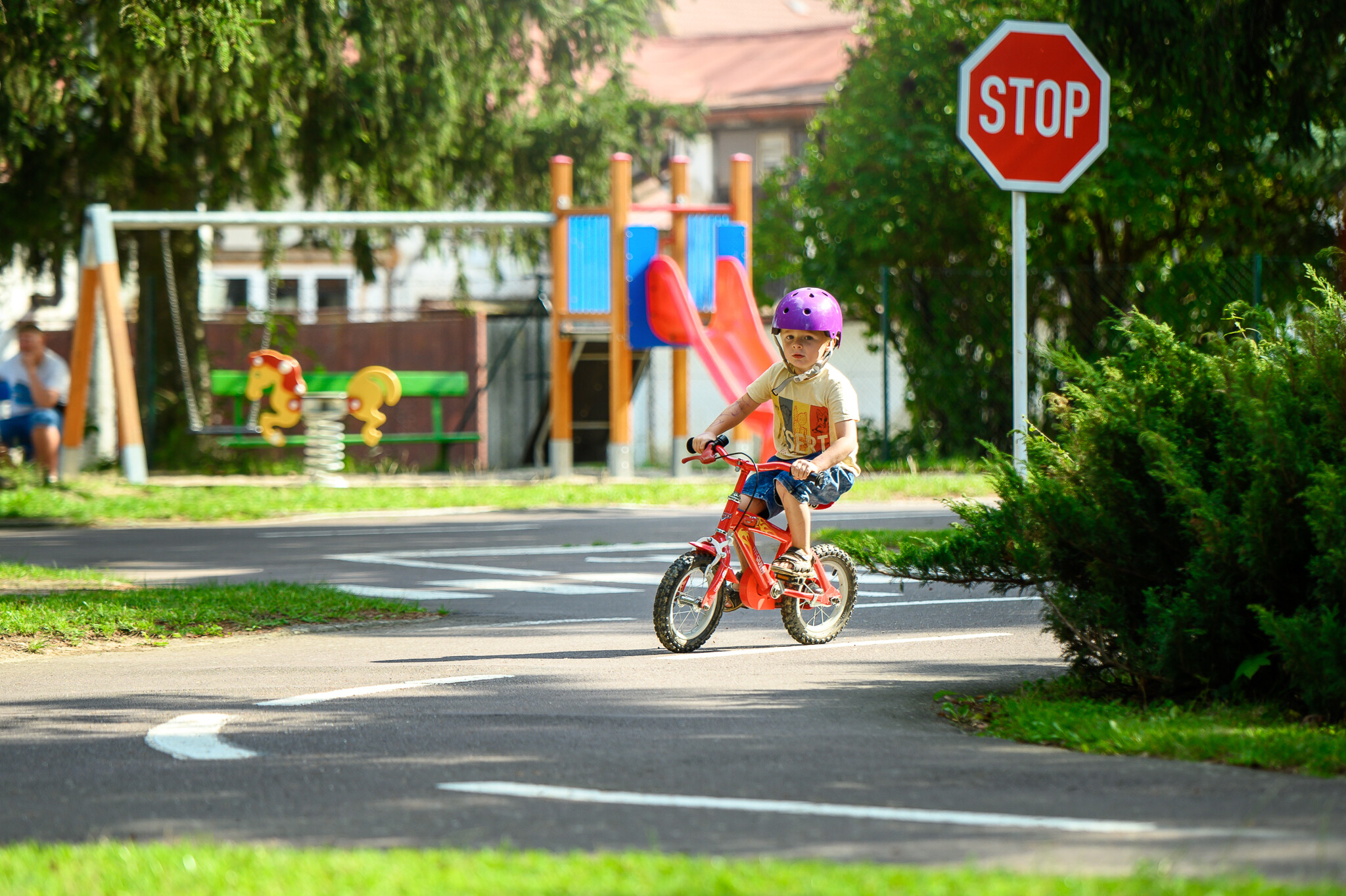 Děti a mladiství do 18 let věku musí být vybaveni vlastní cyklistickou helmou. Z hygienických důvodů provozovatel hřiště helmy nepůjčuje.