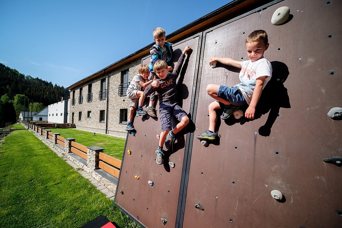 Pro začátečníky je lepší Jezerní stěna přímo naproti Vírské přehradě. Až pokoříte nejlehčí okruh, můžete zkusit i další – na nich překonáte nepálský nebo lanový most a vyzkoušíte si lezení po kramlích připomínajících žebřík. Děti pohodlně dosáhnou všude, kde je potřeba.