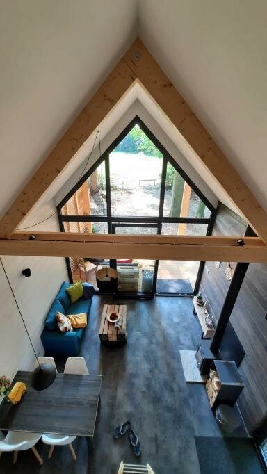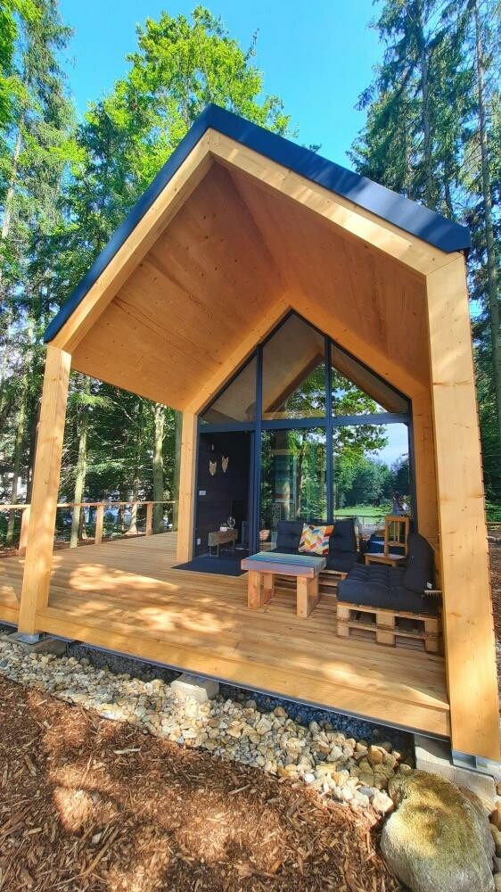 V lůně čisté přírody Vysočiny Vás pod korunami stromů čeká domek s proskleným štítem, útulnou koupelnou, vybavenou kuchyní, krbovými kamny se živým ohněm, velká krytá venkovní terasa a venkovní ohniště.
