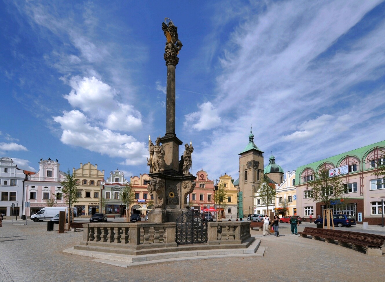 Uprostřed náměstí stojí kašna se sochou Tritona a barokní morový sloup z roku 1725. Na náměstí vykukuje také zpoza rohu kostel Nanebevzetí Panny Marie z konce 13. století s věžními hodinami, které mají místo dvanácti číslic čtyřiadvacet. Náměstí a jeho přilehlé okolí částečně lemují zbytky městských hradeb a rozhlehlý park Budoucnost.