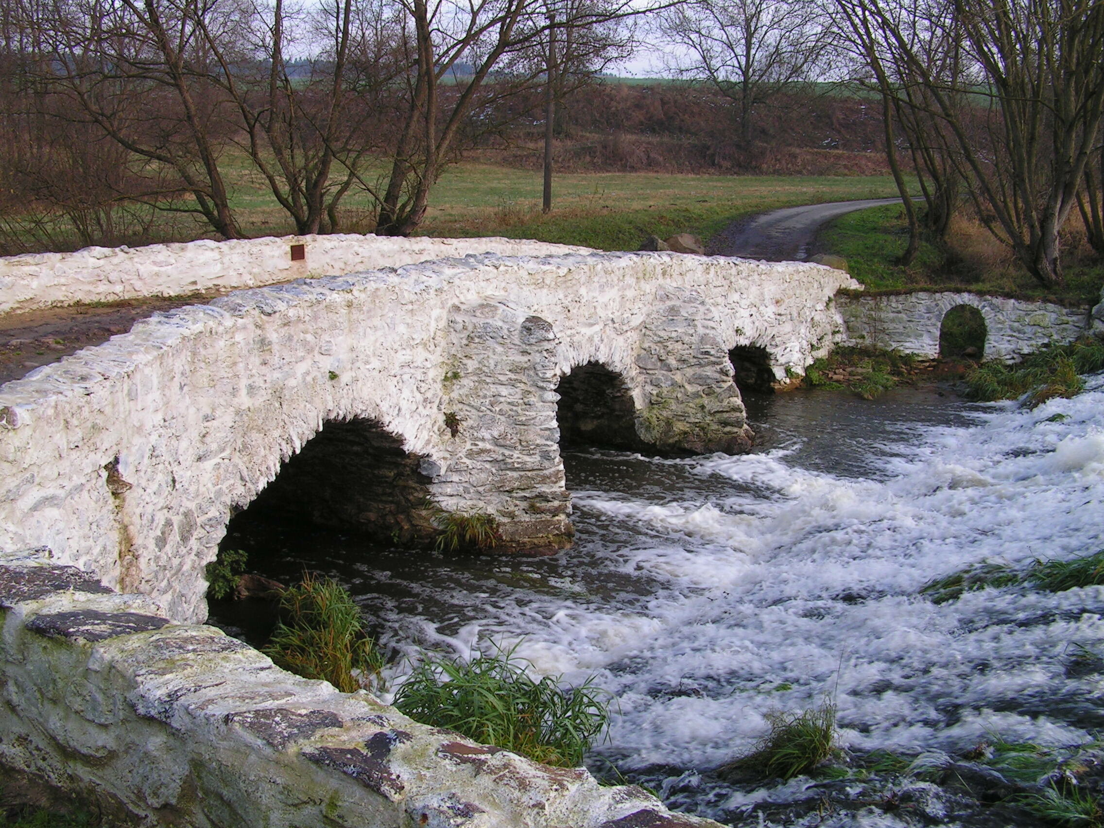 Přesné datum stavby středověkého kamenného mostu není známé. Nachází se u soutoku Zlatého potoka a Šlapanky nedaleko Polné, ovšem už v havlíčkobrodském okrese. Most je zřejmě posledním svědkem takzvané Moravské stezky vedoucí z Prahy do Brna, která se zde napojovala na stezku Haberskou, spojující Prahu s Jihlavou a Vídní. Svým stářím se tak památka řadí mezi nejstarší v Čechách a je pravděpodobně starší než most v Ronově.