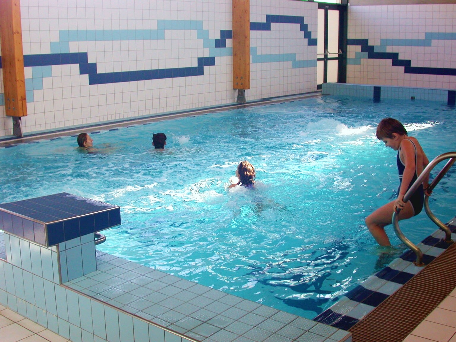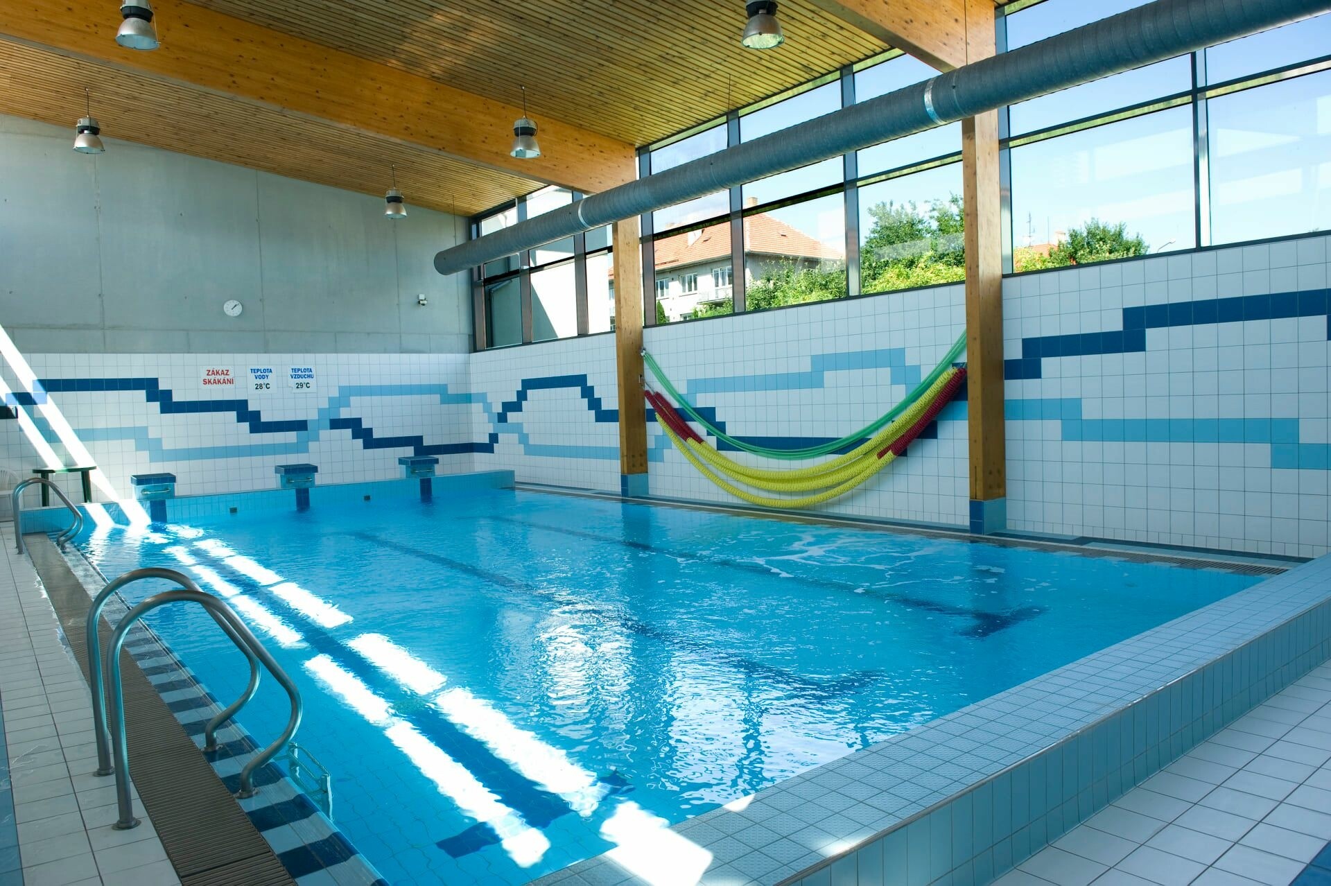 Jeho rozměr je 12,5 x 6,5 m, hloubka od 1,1 - 1,6 m a teplota vody je stabilně mezi 28 - 29°C. Bazén má bohatý rehabilitační program, který se skládá z protiproudu, dnových a stěnových masážních trysek a bloweru. Dětem je k dispozici skluzavka. Příjemnou atmosféru v bazénu dotváří podvodní osvětlení, které je s oblibou využíváno v podvečerních a večerních hodinách všemi návštěvníky. Pro malé neplavce nabízíme nejrůznější plavecké pomůcky včetně kroužků, desek a pásků. Bazén je využíván plaveckou školou pro výuku plavání dětí ze škol a školek, několikrát v týdnu se v bazénu cvičí aquaerobik. Nejvíce zde plavou jednotliví návštěvníci, ale často si také celý bazén objednávají rodiny a uzavřené skupiny. Podobně je bazén využíván při různých kempech a soustředěních na rehabilitaci po náročném tréninku. Naším spoluobčanům se zdravotním postižením usnadňuje vstup i výstup z vody bazénový elektrický zvedák s nosností do 130 kg. K úhradě bazénu lze využívat rovněž předplacenou permanentku nebo bodový čip.