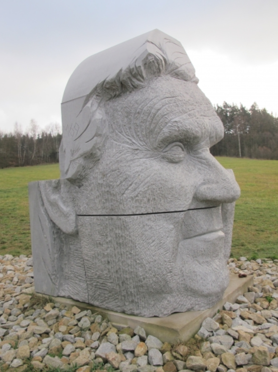 Téměř tři metry vysoká a 18 tun těžká žulová hlava stojí na zelené louce u křižovatky cest Lipnice nad Sázavou a Dolní Město.