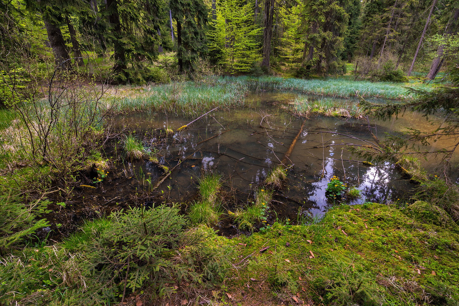 Celá oblast Ranských jezírek je kryta druhotnými smrčinami, místy s vtroušeným bukem. Bylinný pokryv však dokumentuje, že celá zdejší oblast byla před těžební činností kryta bučinami, snad s vtroušeným smrkem. V lokalitě jsou smrky stáří kolem 150 let, výšky kolem 40 metrů a objemu až čtyři metry.
