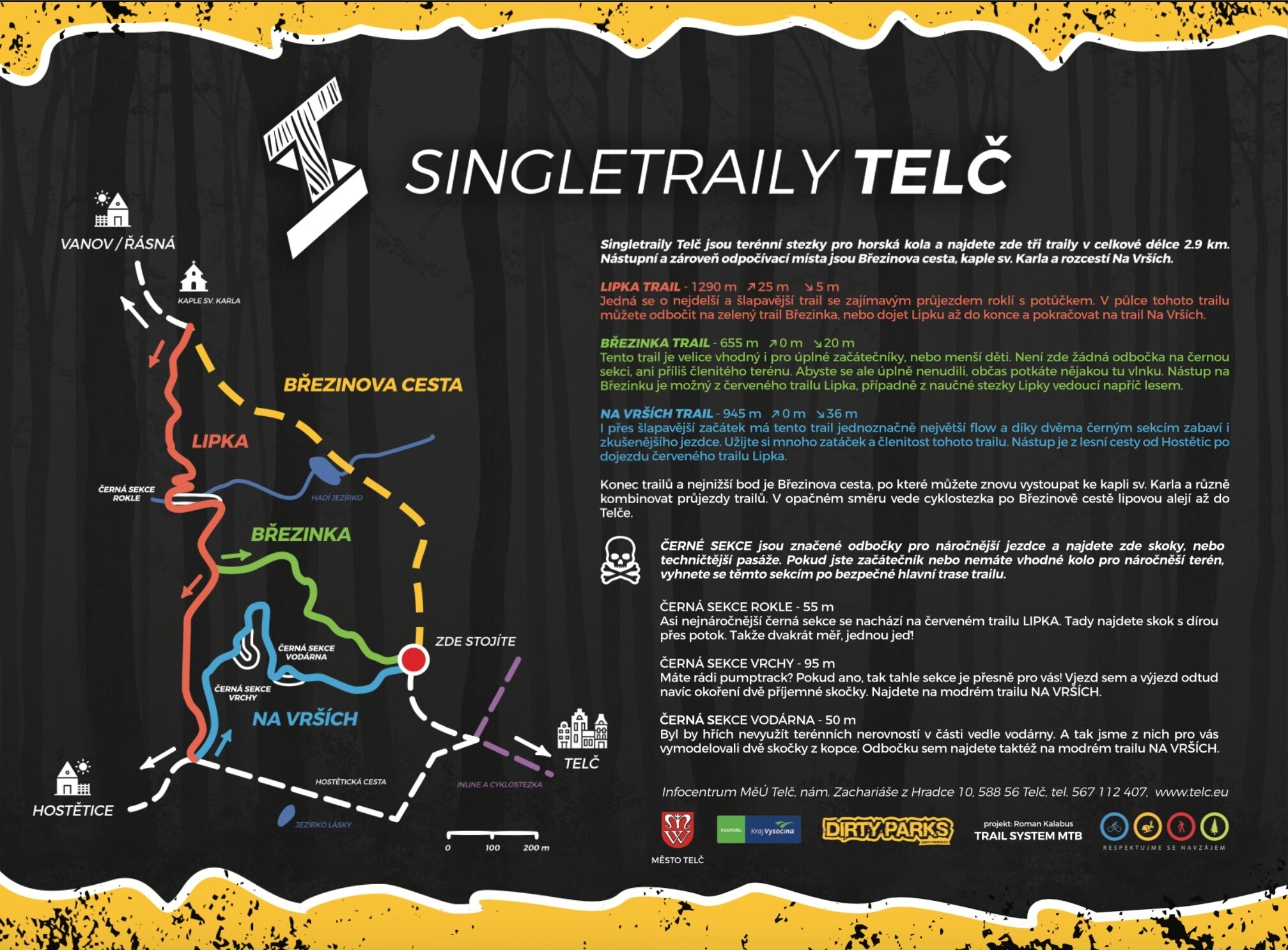 Lipka trail (1 290 m): nejdelší trať s průjezdem roklí a potůčkem. V půlce můžete odbočit na Březinka trail, nebo pokračovat směrem na Hostěnice. Cestou si trochu více šlápnete do pedálů.