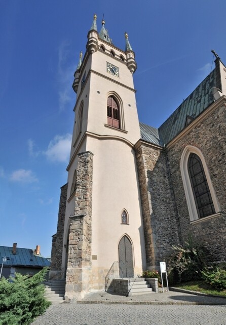 Věz kostela sv. MikulášeNa místě kostela stála původně kaple, o niž lze dohledat písemnou zmínku již v roce 1233. Kolem poloviny 13.století byl díky bohatým ložiskům zlata v okolí města zpracován plán na stavbu zděného kostela. Jak v této době kostel vypadal, nevíme. Podoba je známá až z nejstaršího dochovaného vyobrazení města z konce 18. století. V polovině 90. let 19. století dovolil průmyslový rozvoj města financovat přestavbu barokního kostela do novogotické podoby, která se dochovala dodnes.