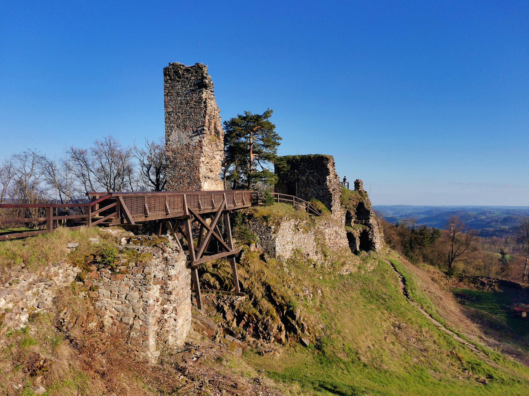 Virtuální prohlídkaHrad patřil k nejvýznamnějším sídlům mocného rodu pánů z Pernštejna. Byl vybudován na protáhlém skalnatém hřebenu na pravém břehu řeky Svratky nedaleko obce Pivonice, aby chránil obchodní cestu vedoucí z Brna na Poličku. Poslední doklad o tom, že byl rozlehlý hrad obydlen, je z roku 1522. Dochován je zbytek severní vstupní věže a velká část hradního paláce. Ke hradu se pojí i řada pověstí. O pokladu ve zřícenině, o tajné chodbě, o duchu nešťastné Blaženky, která zde pyká za svou zrazenou lásku.