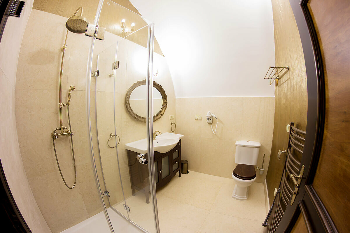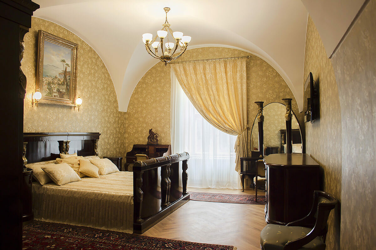 Pokoje jsou zařízené v klasickém zámeckém stylu, starožitným nábytkem. Součástí apartmánu je také vlastní sociální zařízení v retro stylu. Pokoje nabízí jedinečný výhled do zámeckého parku.
