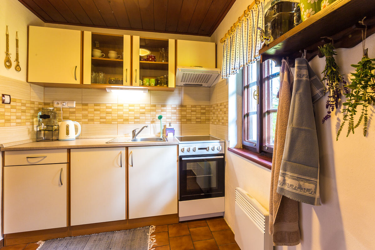 V chaloupce jsou k dispozici 2 ložnice o celkové kapacitě 6 lůžek, obývací pokoj s krbovými kamny, satelitní TV a wifi, vybavená kuchyň s mikrovlnou troubou a lednicí, koupelna se sprchou. K dispozici je také zahrada se zahradním sezením, ohništěm a trampolínou.