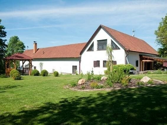 ...7 x 4 m, dále zastřešenou vířivku 2,5 x 1,5 m s celoročním provozem umístěnou na dvoře chalupy, místnost s fitness a saunu s odpočívárnou, která se nachází uvnitř objektu. K dispozici je oplocený pozemek o celkové rozloze 2 000 m2 s dřevěným altánem (12 x 6 m) a zahradním posezením pod pergolou, grilem (dřevěné uhlí je možné si dovézt vlastní), udírnou, pískovištěm a domečkem pro malé děti. Zastavěná plocha objektu je 240 m2.