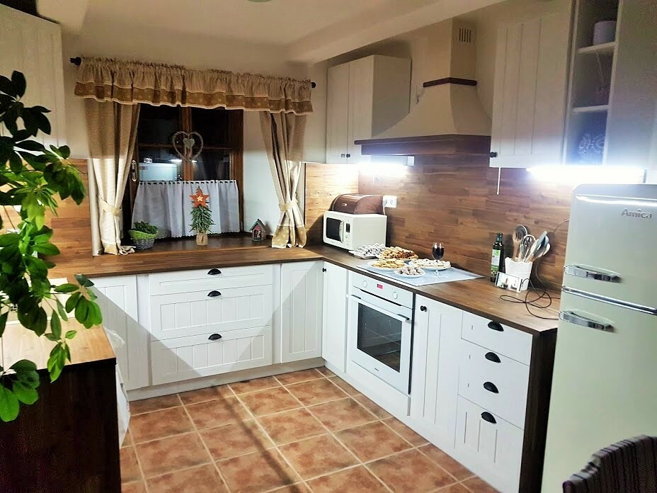 - stylovou kuchyň s nadstandardním vybavením - myčka, kávovar, mikrovlnná trouba, topinkovač, rychlovarná konvice, indukční varná deska, trouba, lednice s mrazákem, tyčový mixér, váha na potraviny, hrnce, pánve, plechy, "papiňák", pečící formy na bábovku, muffiny ad., veškeré nádobí - včetně sklenic na víno, pivo, panáky, šálky na kávu, hrnky na čaj a veškeré kuchyňské náčiní