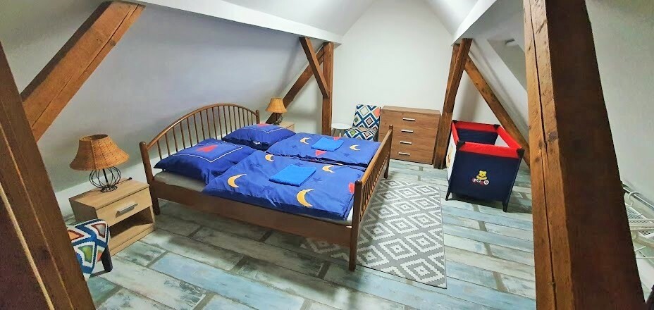 - ložnici s manželskou postelí a dětskou postýlkou.