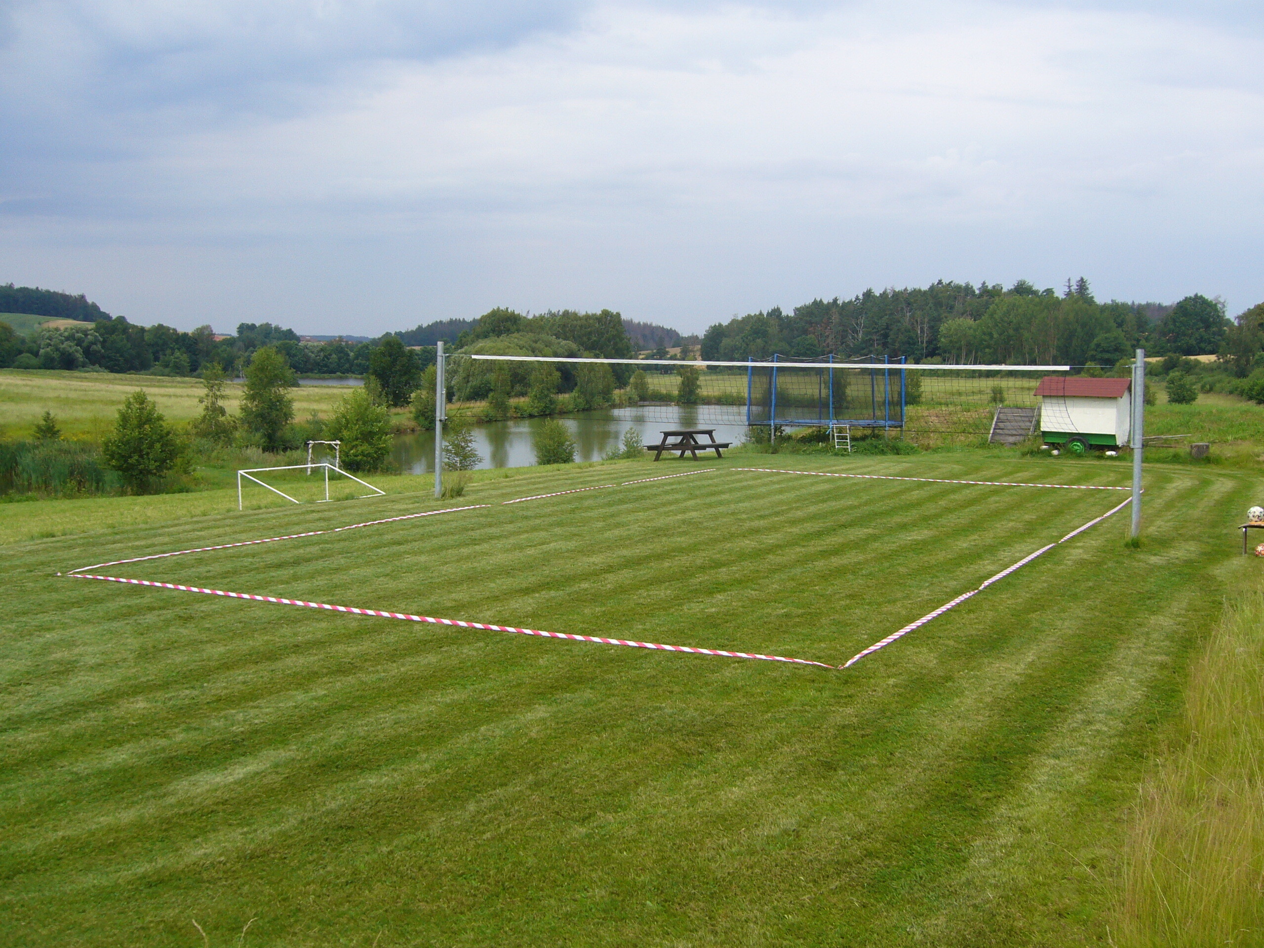 Travnaté hřiště 15 na 30*volejbal,nohejbal* trampolína, terasa s krbem, pramice nebo možnost koupání.