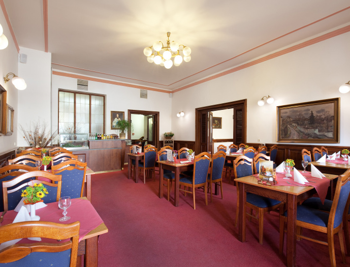 Na ubytovací část hotelu přímo navazuje přízemní restaurace pro více než 100 osob členěná na dva salonky, součástí je i privátní salonek pro 12 osob. V letních měsících je před podloubím navíc zařizována předzahrádka. V části prvního poschodí je místnost s tanečním parketem s kapacitou přibližně 80 míst. Dřevěnou shrnovací stěnu lze tuto místnost rozdělit na dva samostatné salonky pro 50 a 30 hostů.
