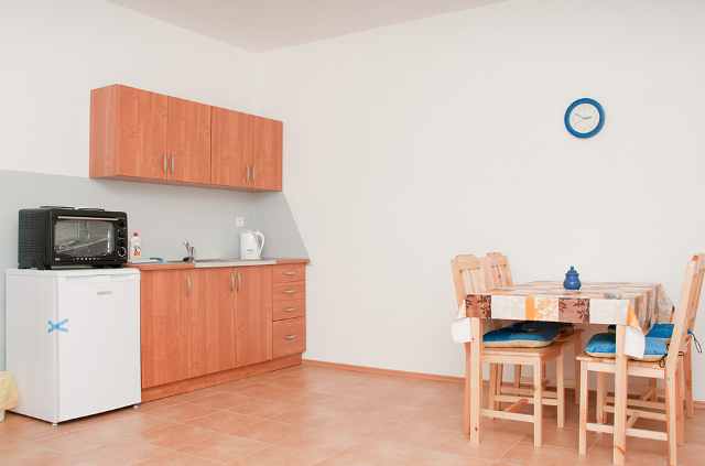 Každý apartmán je vybaven vlastním sociálním zařízením (koupelna se sprchou + WC), LCD televizorem a kompletně vybavenou kuchyňkou včetně spotřebičů.