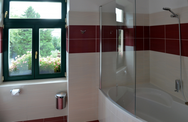 Všechny pokoje mají vlastní koupelnu s podlahovým vytápěním. Vybaveny jsou vanou nebo sprchovým koutem a WC.Ke standardnímu vybavení pokojů dále patří LCD televize s možností připojení externích médií, rychlovarná sada s nabídkou čajů a kávy, minibar, pokojový telefon, trezor na vaše cennosti a fén.