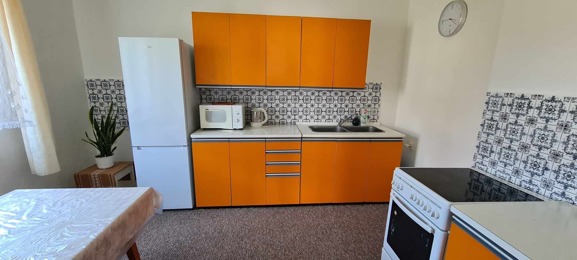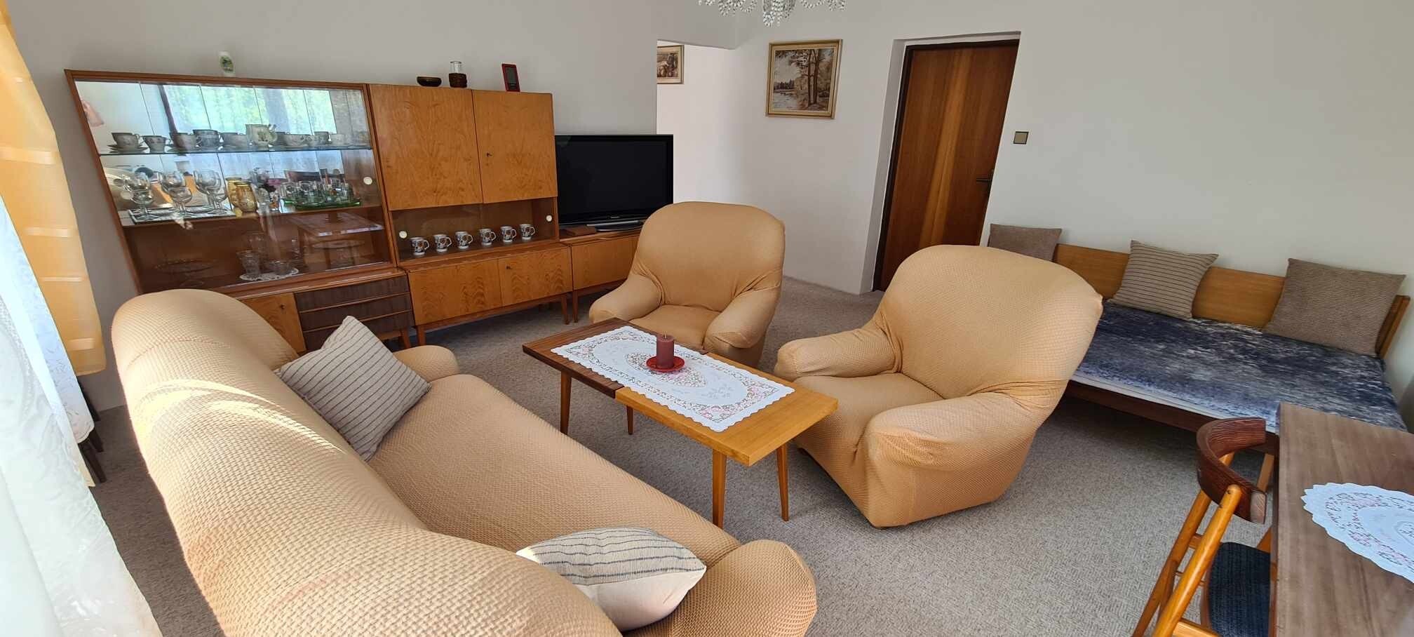 Apartmán 4+1 Vám nabízí celkovou kapacitu 5 lůžek. Tvořený je obývací místností s rádiem, křesly, gaučem a rozložitelnou pohovkou, která je vhodná jako plnohodnotné lůžko pro 1 osobu. Z obývacího pokoje vede výstup na balkon s výhledem do zahrady. Tato místnost je propojena také s jídelní částí, kde si můžete dopřát kávičku či vlastnoručně připravený oběd. K jeho přípravě Vám poslouží vybavení v kuchyni. Zde jsme pro Vás připravili elektrický sporák s troubou, mikrovlnnou troubu, rychlovarnou konvici, lednici s mrazákem a jídelní stůl s židlemi.