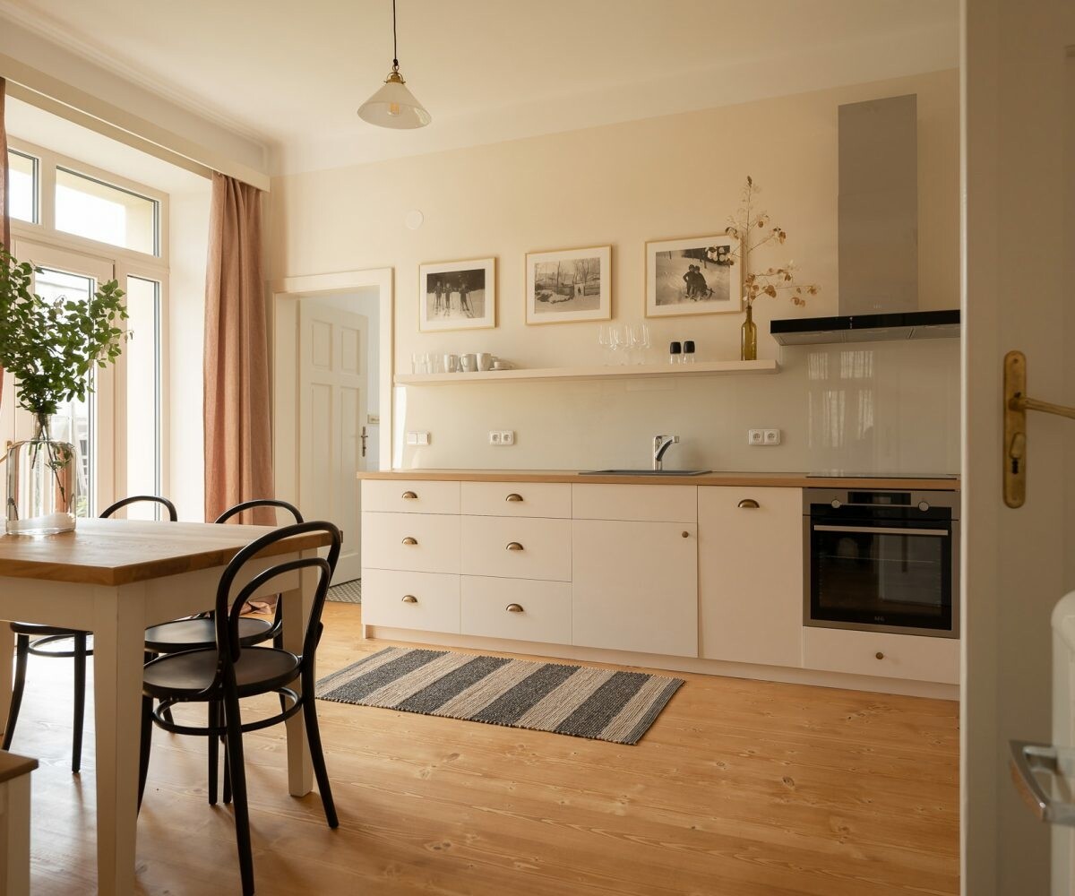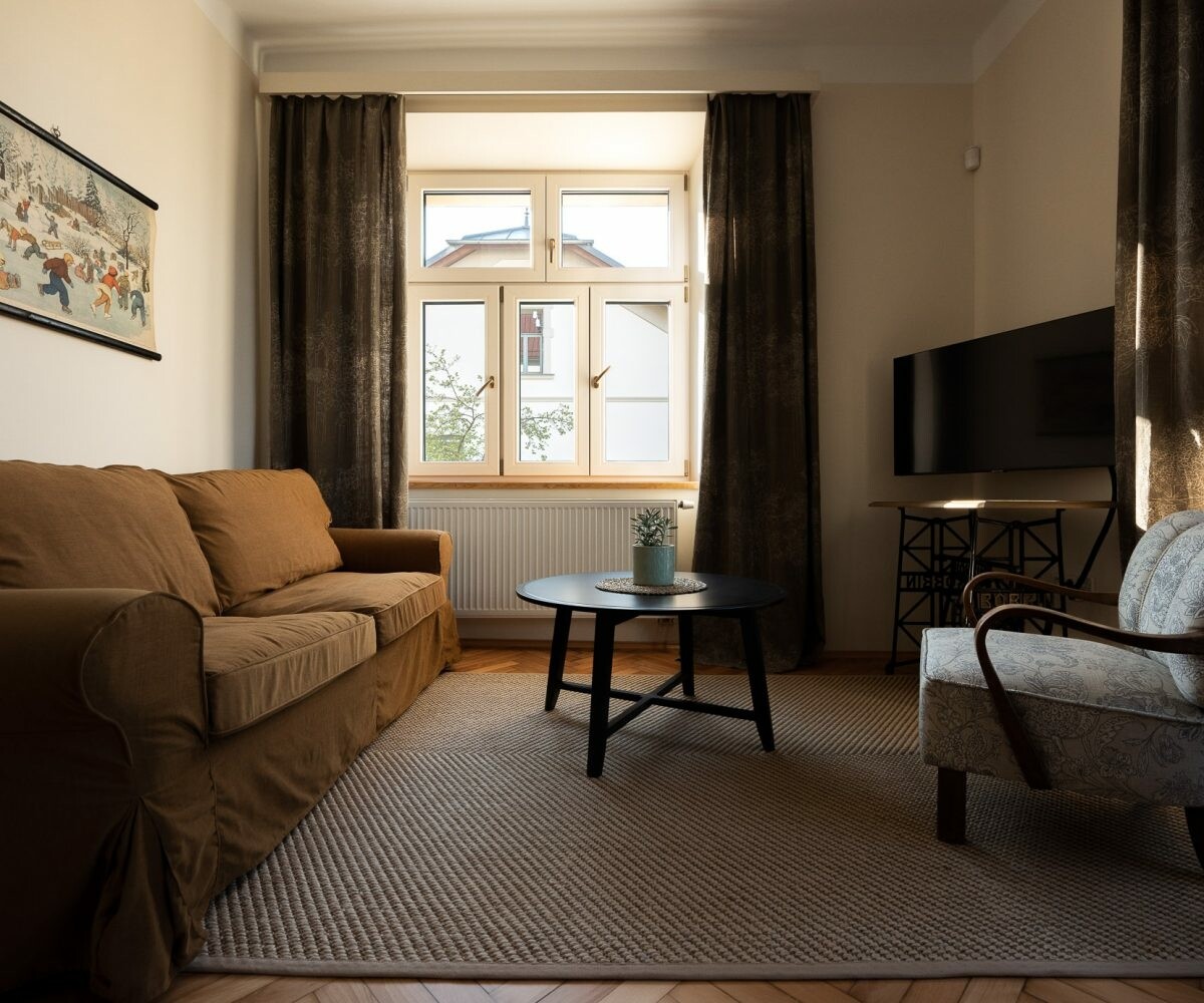 Malovaná dlažba v chodbě Vás povede do prostorného apartmánu o ploše 100 m². Pohodlí si zde užije až šest osob. Dvě ložnice, obývací pokoj, kuchyň s jídelnou a koupelna s toaletou tvoří kouzelnou galerii plnou stylových detailů, přírodních dřevěných materiálů a lněných závěsů. Výhodou je možnost objednání menší varianty ubytování pro čtyři. Pokud prostě jednu ložnici nebudete potřebovat, zamkneme ji. K dispozici máte také prostor zahradního domku, který lze využívat jako společenskou místnost.