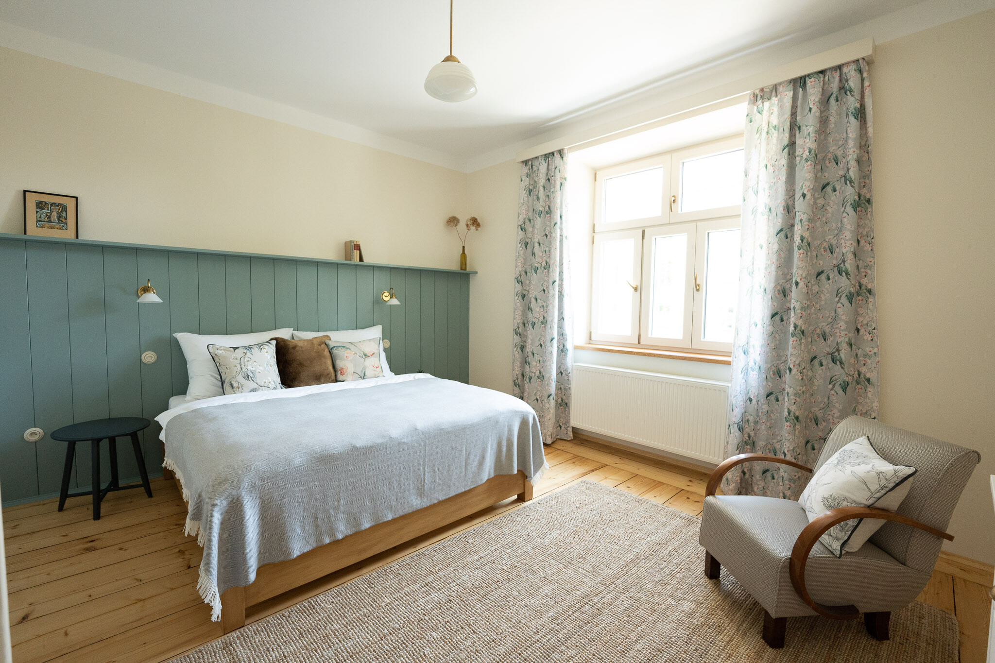 Co jsme mohli, jsme zachovali. Kromě restaurovaných dekorací a autentických fotografií, které jsme našli na naší půdě a ilustrují život na Vysočině, jsou dalším důležitým prvkem látky. Nádherné lněné závěsy, vlněné přehozy, měkoučké polštáře nebo osobitě potažená křesla jsou třešničkou celé vily. Dlouholetá práce s anglickými značkami látek, láska k látkám a cit pro kombinace materiálů a barev je náš signature. Showroom látek Romo je hned ve vedlejší vile a rádi vás tam necháme nakouknout.