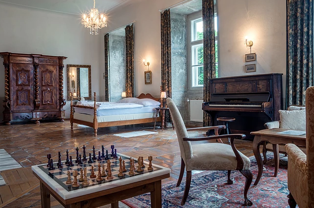 Pokoje na zámku jsou velmi prostorné, vybavené zčásti historickým mobiliářem. Každý pokoj má vlastní toaletní zázemí a prostor k posezení, relaxaci či pracovním aktivitám s využitím otevřeného WiFi připojení.
