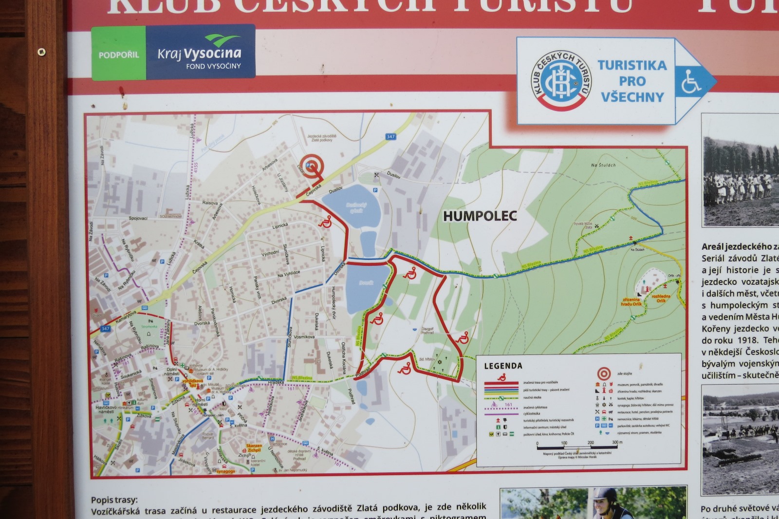 Vozíčkářská trasa začíná u restaurace Saloon Zlatá podkova u jezdeckého závodiště v Humpolci. Vede mezi rybníky Dusilovským a Dvorákem až k Židovskému hřbitovu krásnou krajinou pod Orlíkem Na startu je několik parkovacích míst, bezbariérová restaurace a WC. Celý úsek je vyznačen směrovkami s piktogramem vozíčkáře. Okruh je navržen jako jedno směrný proti směru hodinových ručiček. Je dlouhý 3 kilometry s převýšením 72 metrů.