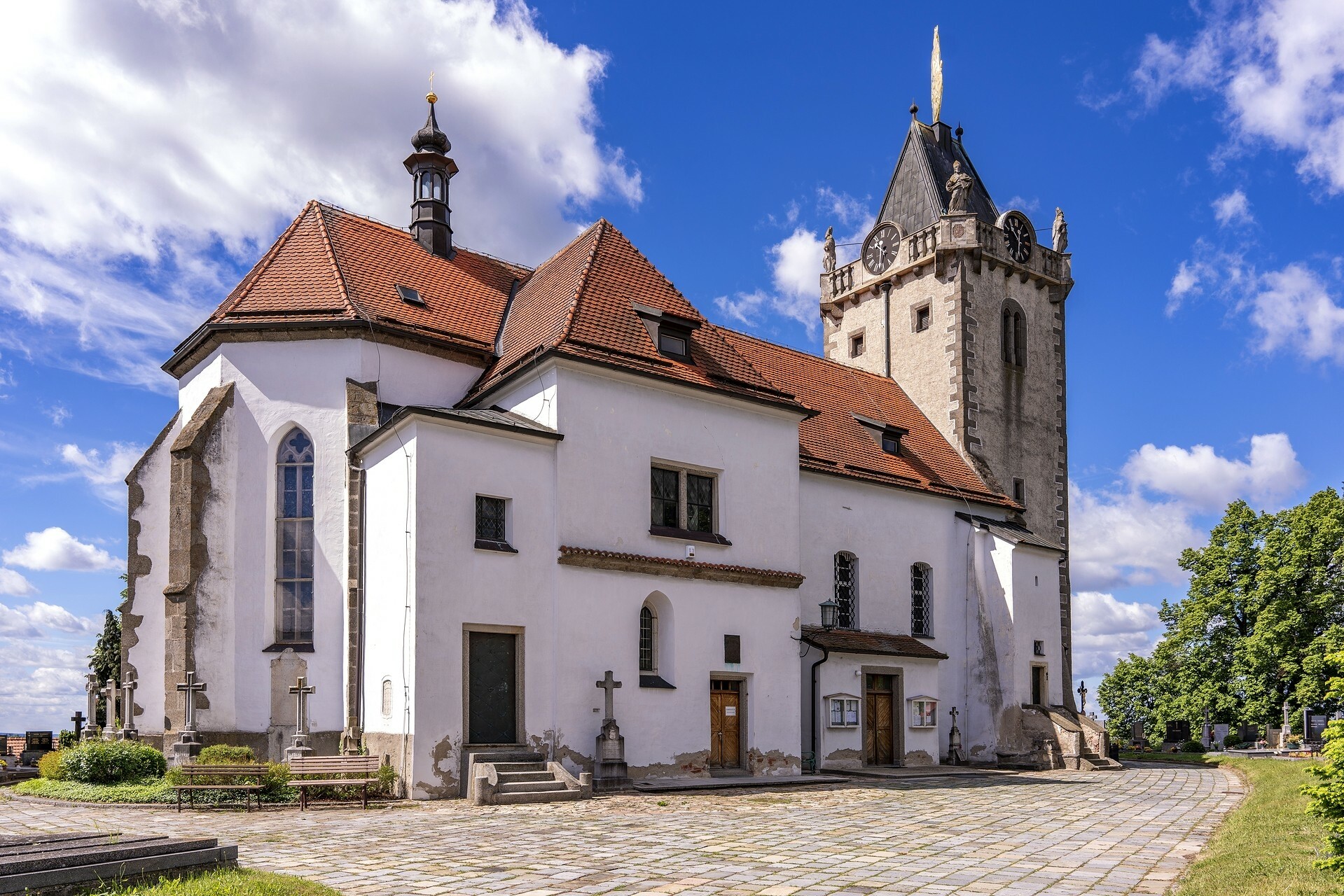 Větrný mlýn je sice na soukromém pozemku, ale ochotní majitelé vás jistě pustí dovnitř. Od mlýna pokračujte polní cestou na vyhlídkové místo. Z něj můžete obdivovat dominantu Budičova, kostelní věž při kostele sv. Gottharda a Panny Marie. Zdaleka viditelná korouhev kostela má 4,2 metru na výšku, 2,5 metru na šířku a váží 440 kg. Je tak největší otočnou korouhví v České republice.