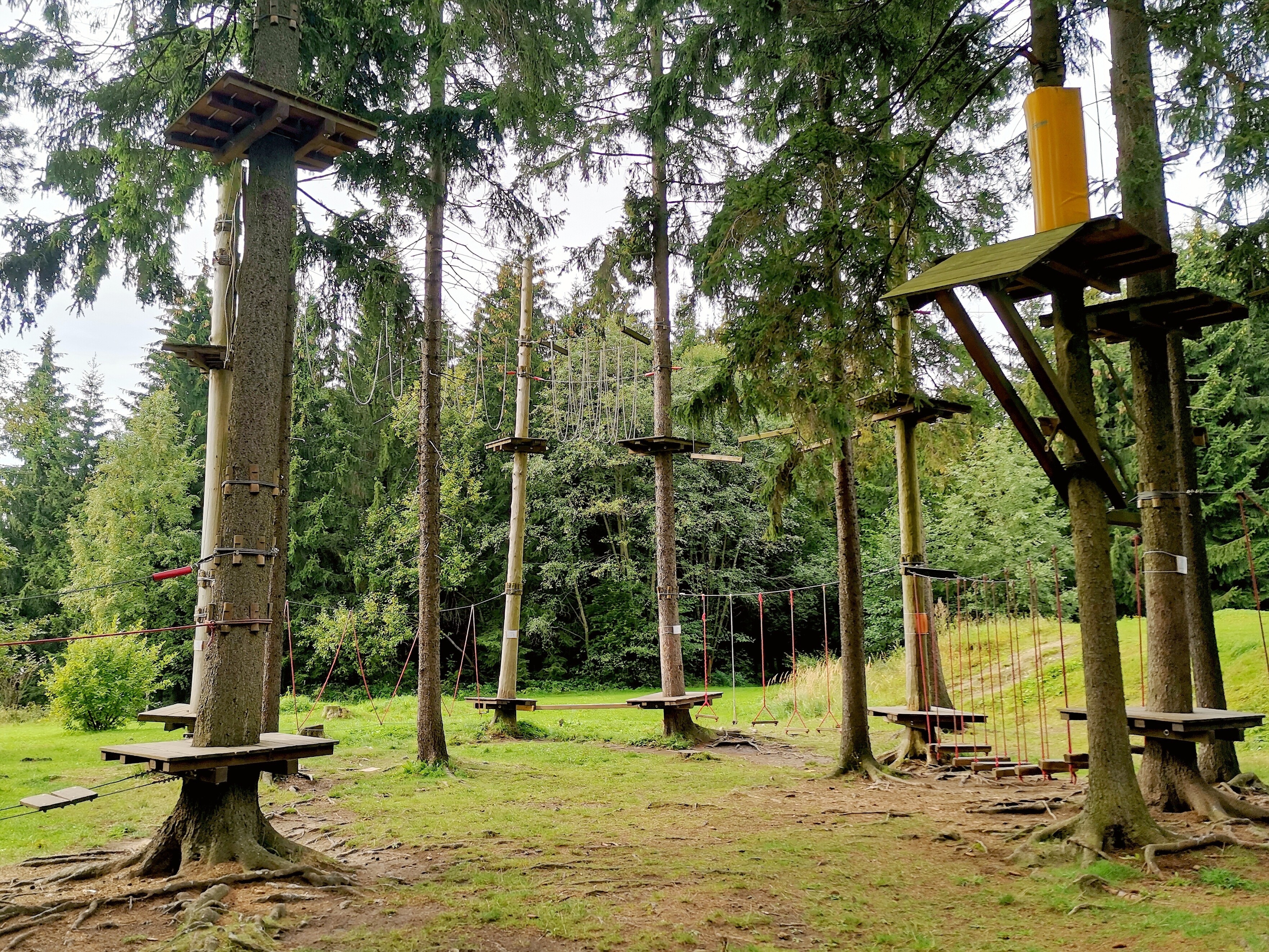 Zelená značka vás nasměruje navede zpátky do Třech Studní, kde určitě vyzkoušejte lanový park u penzionu Sykovec.